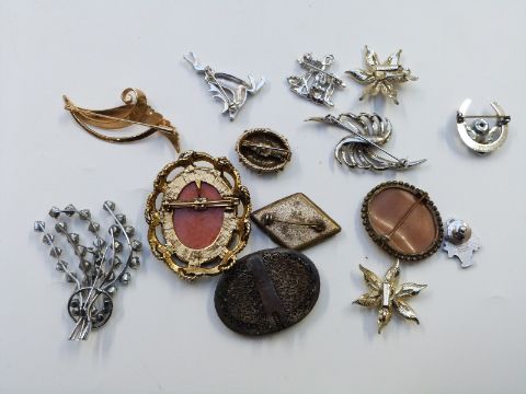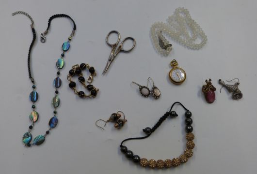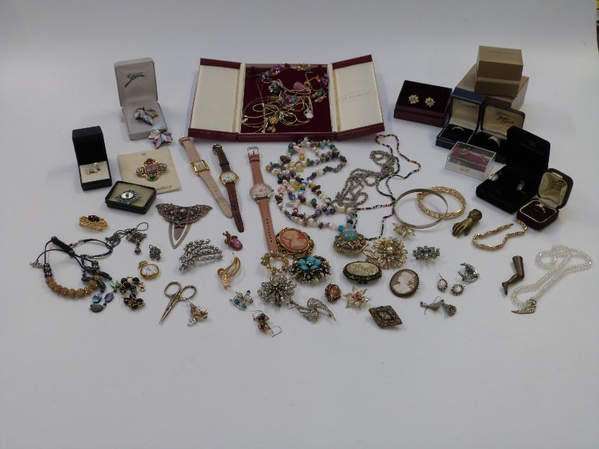 A collection of jewellery including pearl and agate necklace, shell necklace, brooches etc