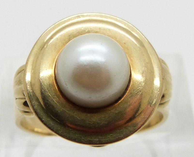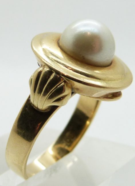 A 14ct gold ring set with a cultured pearl, with shell design to each shoulder, size O