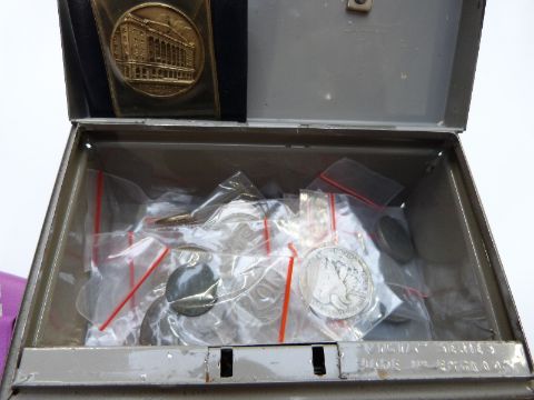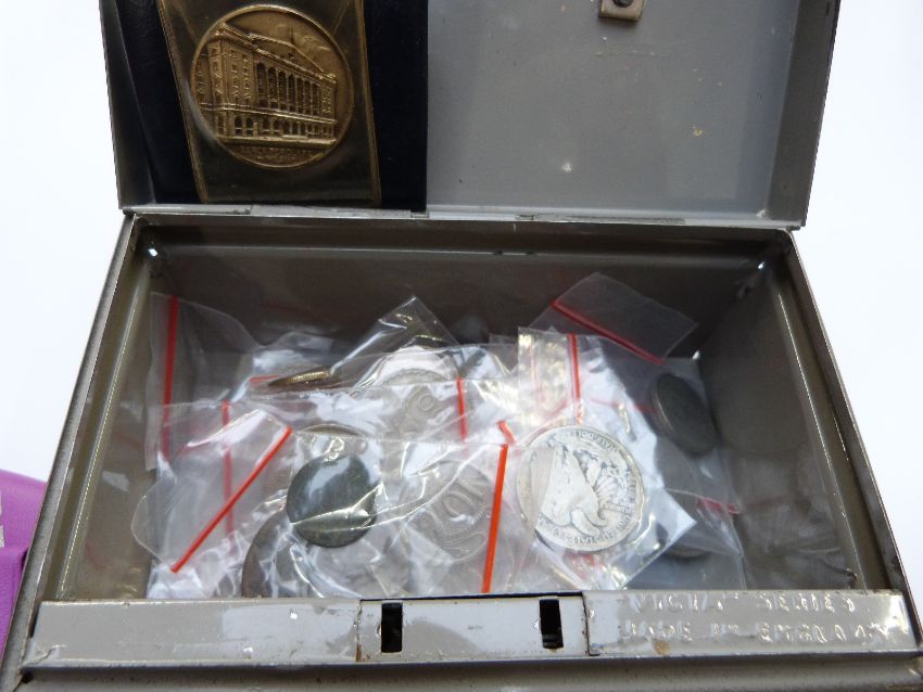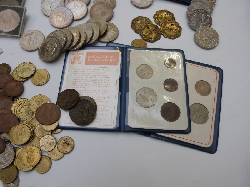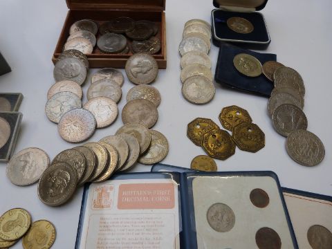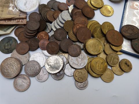 An amateur collection of UK and overseas coinage includes Metropolitan Police commemorative crown, five pound crown, Salford Tramways tokens etc