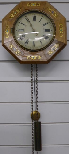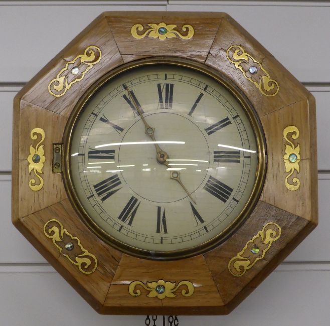 Nineteenth century Black Forest wall clock with thirty hour movement, the Roman dial with pierced brass hands, the octagonal pine case inlaid with brass and mother of pearl decoration, with brass weights and pendulum, dial diameter 17cm.