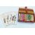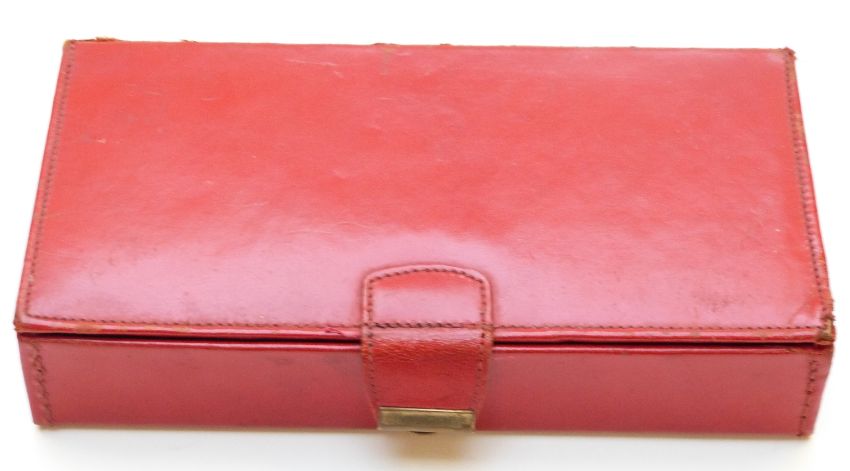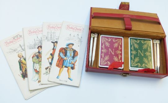A red leather cased Bridge set including four hallmarked silver pencils mounted with playing card / dice finials.