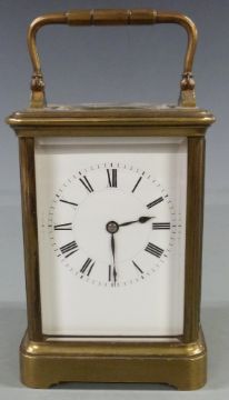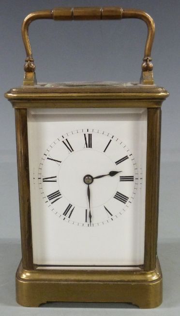 Early twentieth century French brass carriage clock in corniche style case, with white enamel dial and blued spade hands, 13cm tall