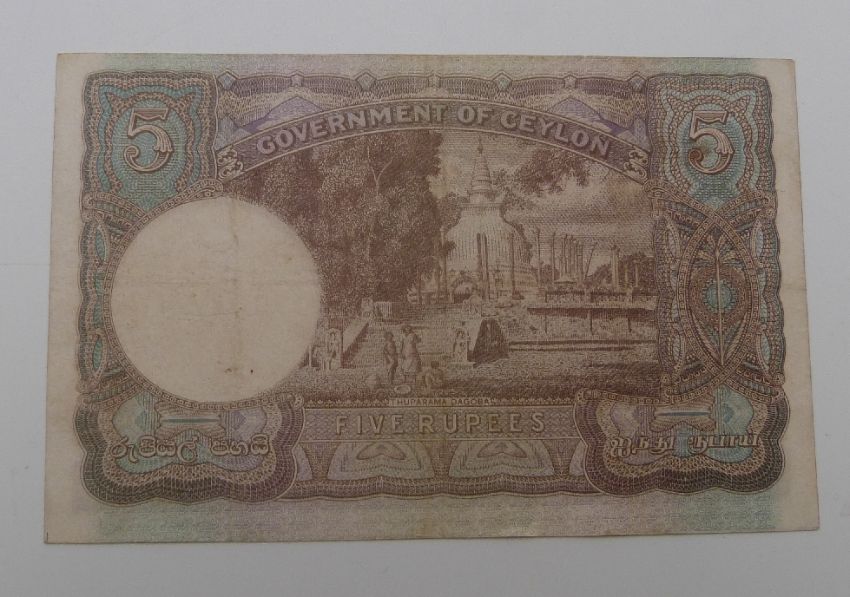 Government of Ceylon 5 Rupees 1944 banknote, clean and crisp