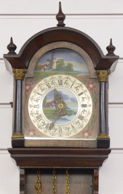 Dutch wall clock with painted arch top dial, silvered Roman chapter ring and cast brass hands, in wooden case with decorated brass inset, 78cm tall together with two further wall clocks including Kienzle c1950 example