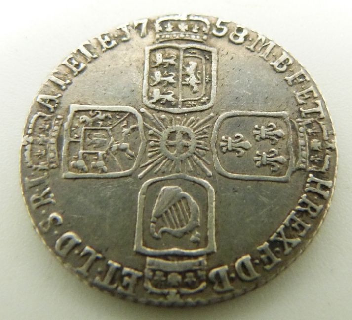 1757 George II sixpence, older head, plain angles reverse, VF