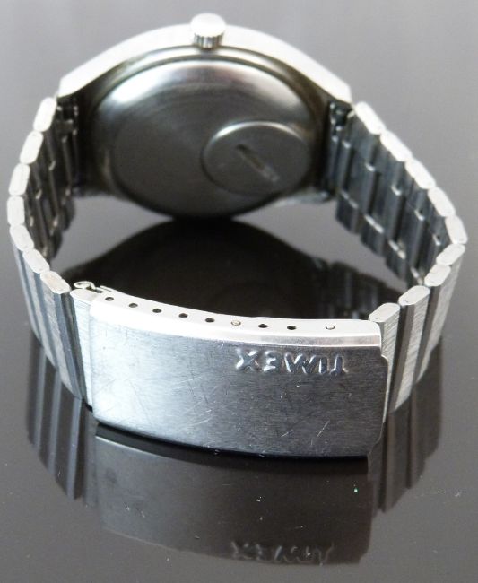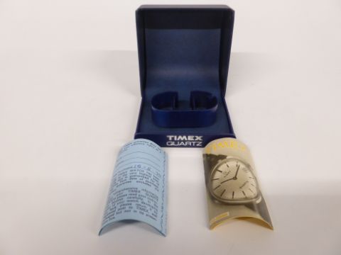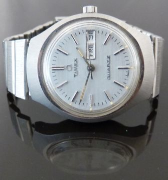 Timex gentleman's wristwatch with day and date aperture, luminous hands, two-tone baton markers, silver face and quartz movement, on stainless steel bracelet, case diameter 37.5mm, in original box.