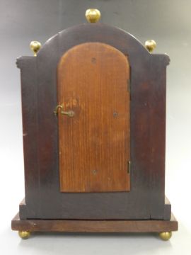 Georgian mantel clock, the enamel Roman dial with steel spade hands, the inlaid mahogany veneered case with brass column, finial and Greek motif decoration, The fusee 'watch style' movement with verge escapement, pierced and masked balance, signed Tho Gilbert, Hythe