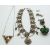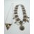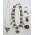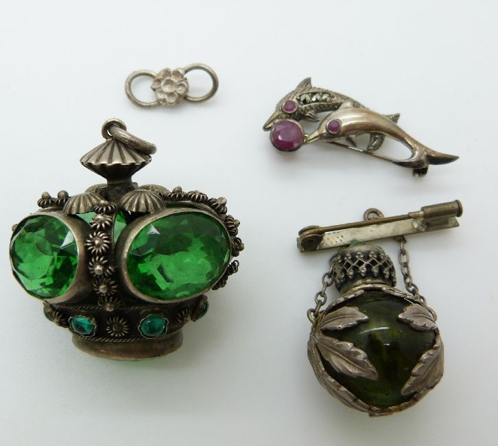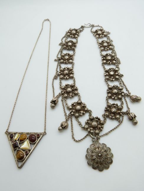 A silver necklace set with tiger's eye and mother of pearl, a silver dolphin brooch set with rubies, a large silver necklace made up of faceted beads and a white metal fob