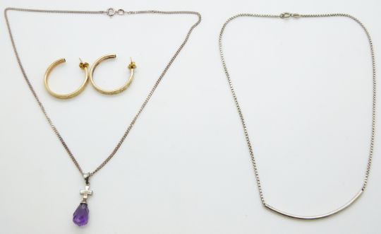 A pair of yellow metal earrings (5.3g) and two silver necklaces