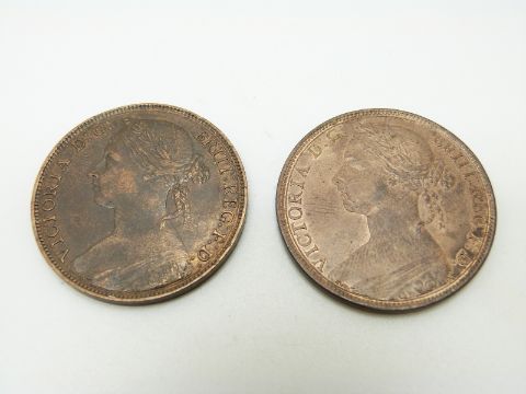 1890 Victorian later young bust bronze penny, OT TB with lustre, EF+ - unc, together with an 1882 Heaton Mint example, VF