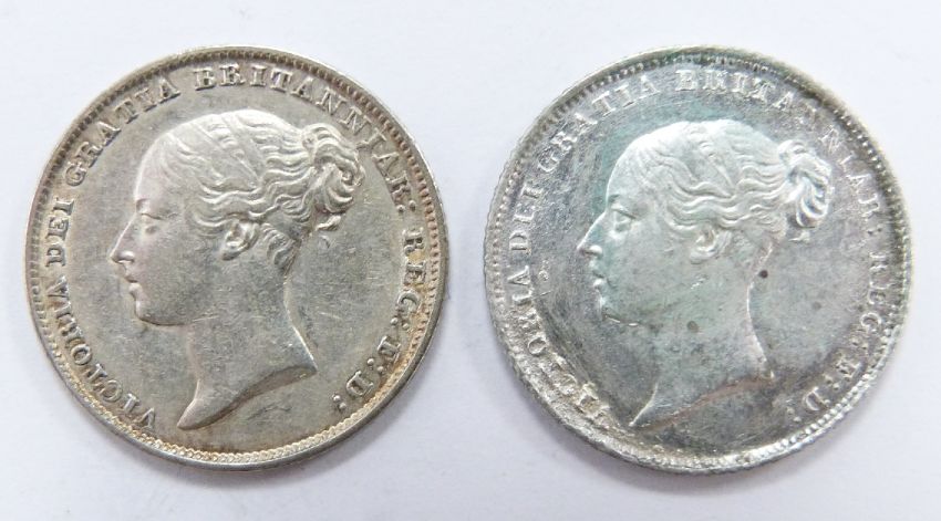 1844 young head Victorian sixpence together with an 1845 example, both GVF