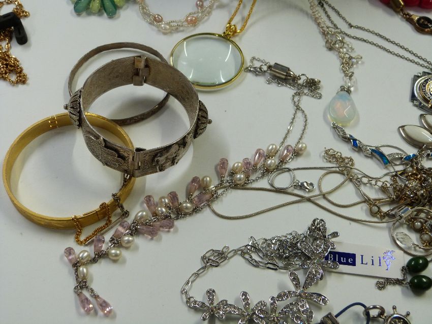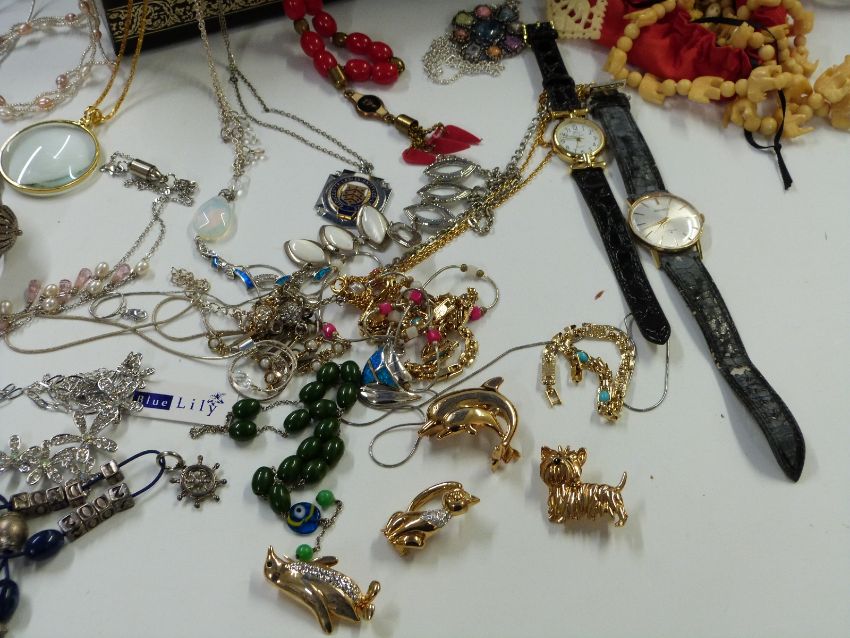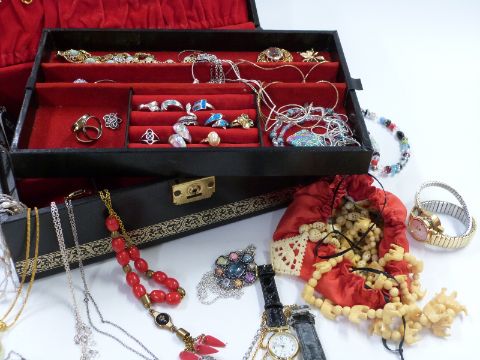 A large collection of costume jewellery including silver rings, beads, silver necklaces, brooches, Trifari necklace, Seiko watch, banknotes etc