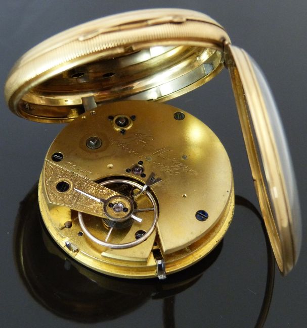 William Morgan of Monmouth 18ct gold open faced centre seconds chronograph pocket watch with gold hands, blued seconds hand, black Roman numerals, stepped cream face, engraved case and signed and engraved movement, case diameter 51mm, serial number 75887