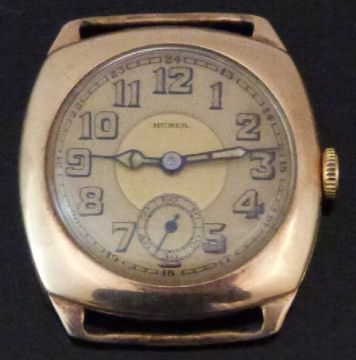 Huber 14ct gold gentleman's wristwatch with inset subsidiary seconds dial, blued and luminous hands, Arabic numerals, gold stepped face and signed 15 jewel Pronto Watch Co movement, case diameter 28mm, serial number 397293.