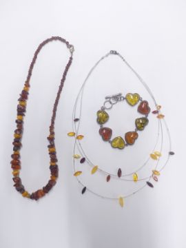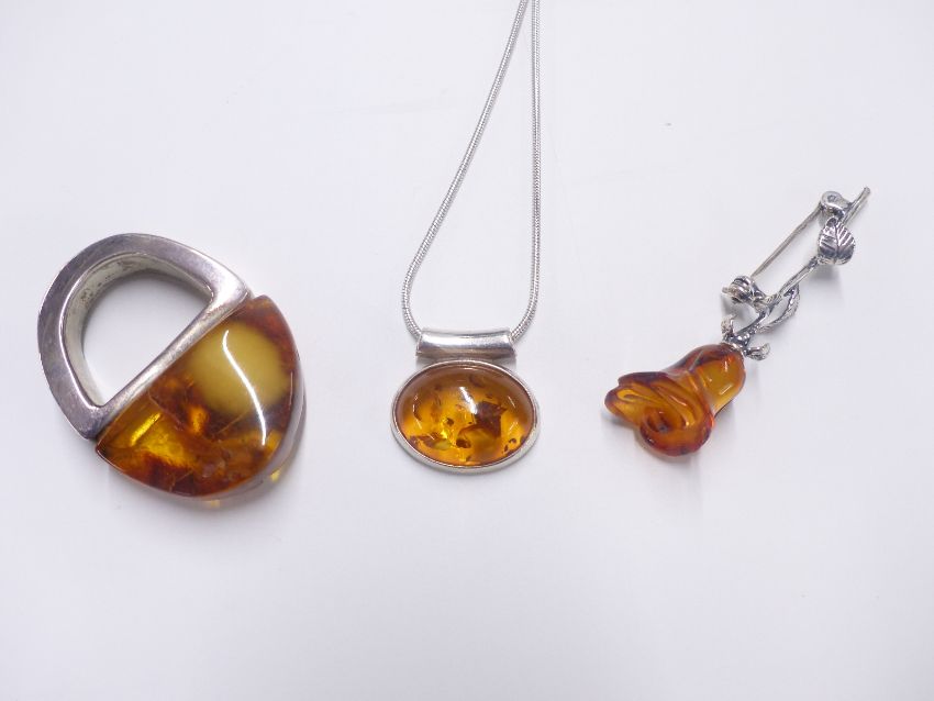 A beaded amber necklace, silver bracelet set with pressed amber, silver and amber necklace, pressed amber pendant, brooch etc