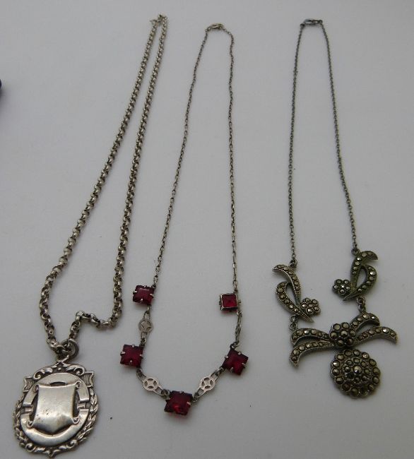 A collection of silver including a fob, another darts fobs, brooch set with agate, marcasite necklace, silver signet ring, marcasite ring etc