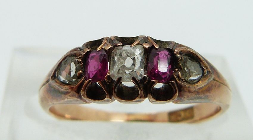 An 18ct gold ring set with diamonds and rubies, size K.