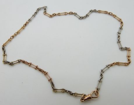 An 18ct gold bi-colored fob chain/ necklace made up of elongated links and knot designs, 18.79g