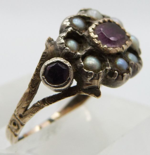 An early Victorian ring set with foiled amethysts and pearls, size N