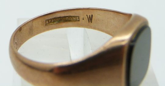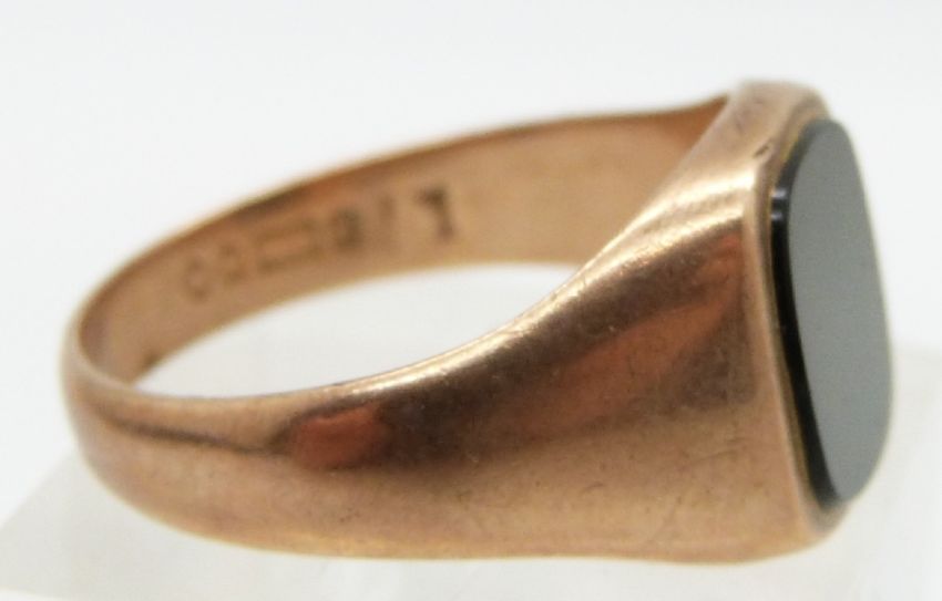 A 9ct gold ring set with onyx, marked Bravingtons, 6.6g, size W