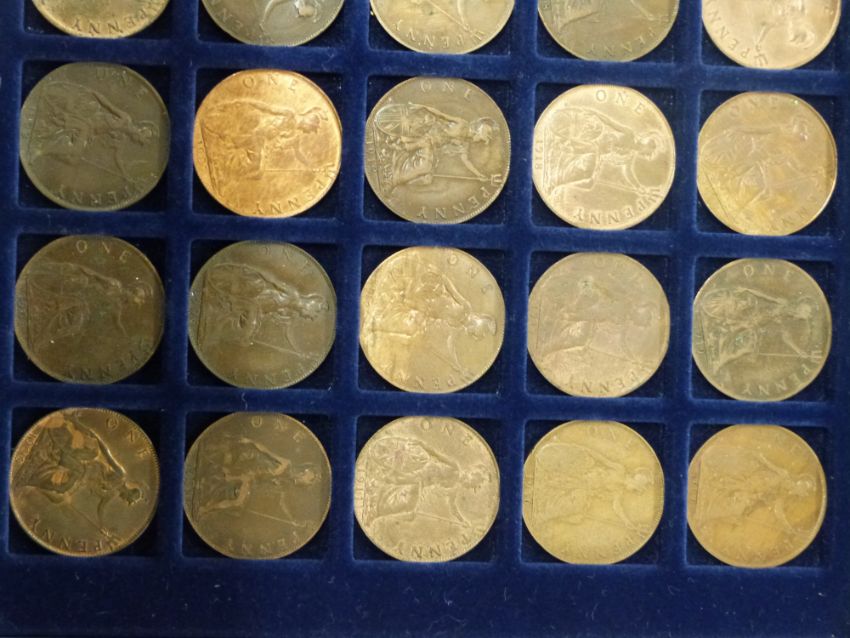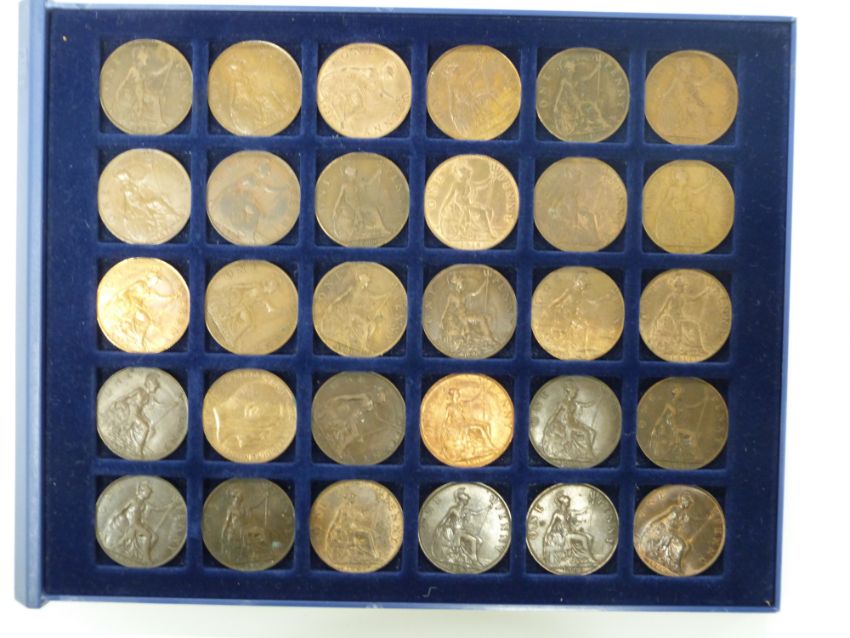 A collection of VF-near unc UK pennies spanning 1900-1926, includes EF-unc 1909 Edward VII, 1907 EF with lustre, 1900 EF-unc etc., 30 coins in all