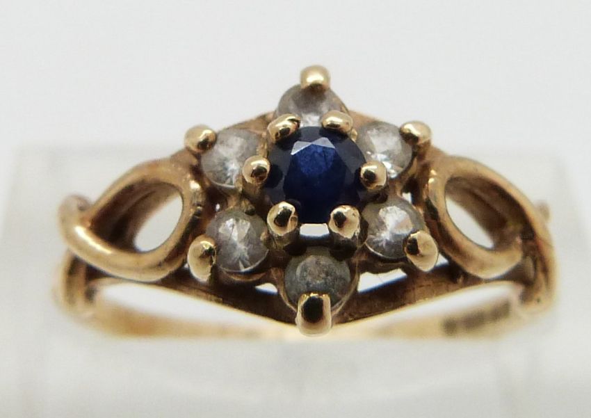 A 9ct gold ring set with a sapphire surrounded by paste, size N