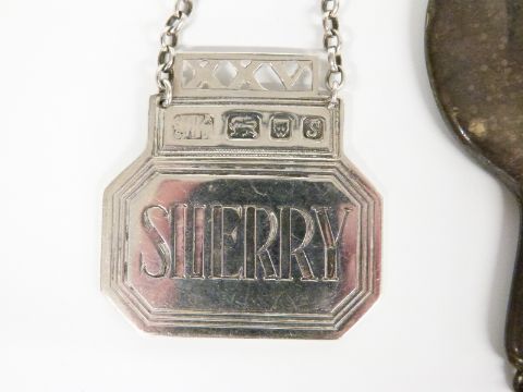 Hallmarked silver sherry bottle ticket with feature hallmarks, two silver thimbles including Charles Horner, needle / cheroot case, watch keys and collectibles