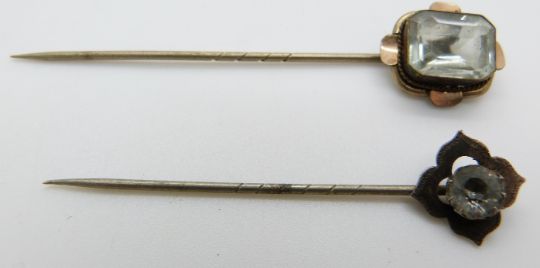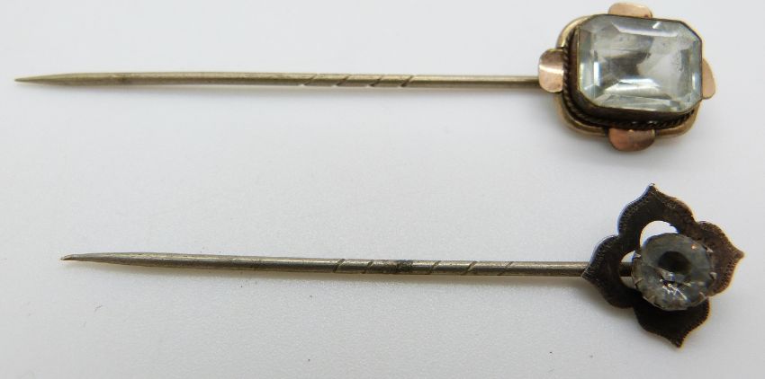 Victorian mourning brooch set with plaited hair, paste buckle, jet brooch and two stick pins