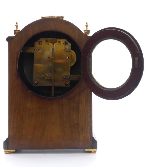 Early twentieth century mantel/ bracket clock, the painted Roman dial with filigree steel hands, signed Edwin Grey, London with single train fusee movement, the mahogany case with banded inlay, raised on brass bun feet, 42cm tall