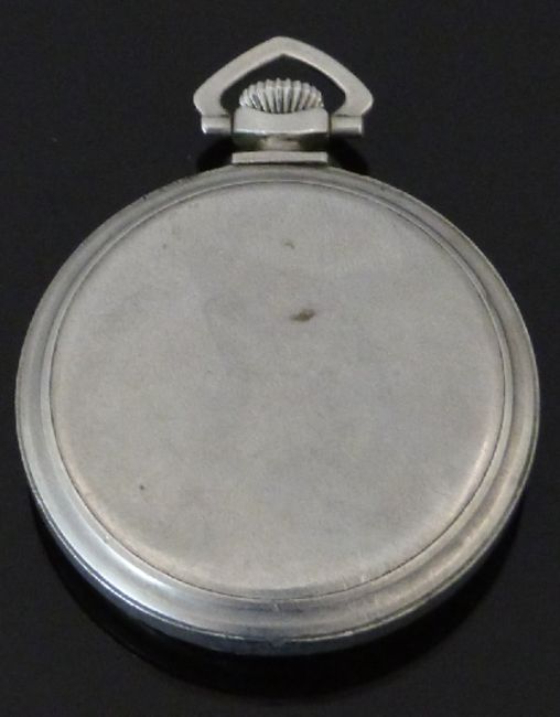 Longines keyless winding open faced pocket watch with subsidiary seconds dial, blued hands, black Arabic numerals, silver dial and signed 15 jewel movement, case diameter 44mm, serial number 6133997.