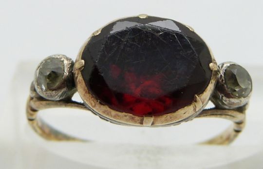 A Georgian ring set with a foiled garnet and an old cut diamond to each shoulder, size H