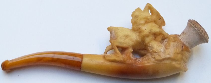 A carved miniature Meerschaum pipe with deer surmount, in original case, 9cm