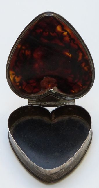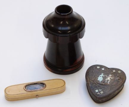 19thC white metal and inlaid tortoiseshell heart shaped trinket box, ivory needle or toothpick case with braided hair panel and a treen / lignum vitae string box or similar
