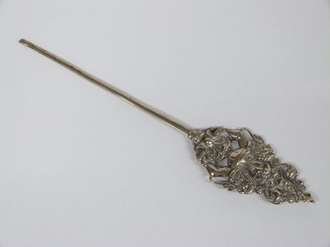 A silver plated stirrer or finial with lion decoration, impressed Sabatier, length 25cm