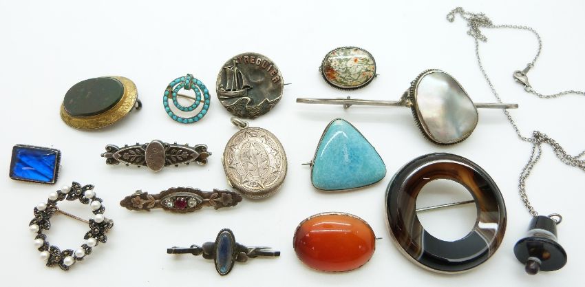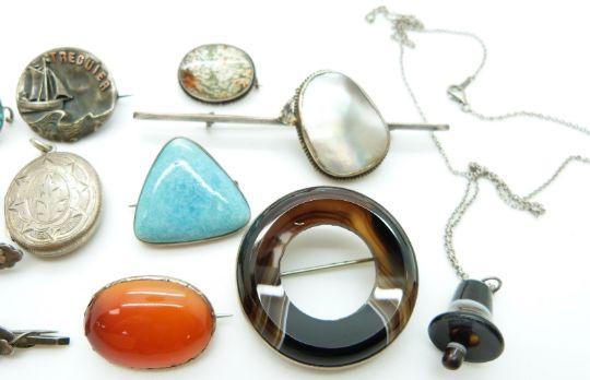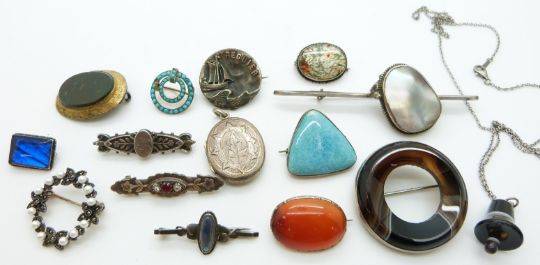 A collection of jewellery including Victorian silver, other brooches including agate set etc