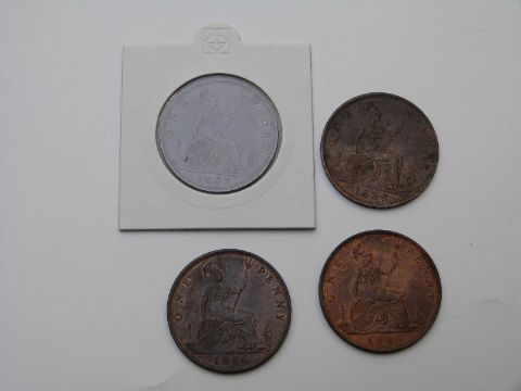 1886, 1887, 1888 and 1889 Victorian bronze pennies, EF or NEF, three with lustre, one darker tone, 4 coins