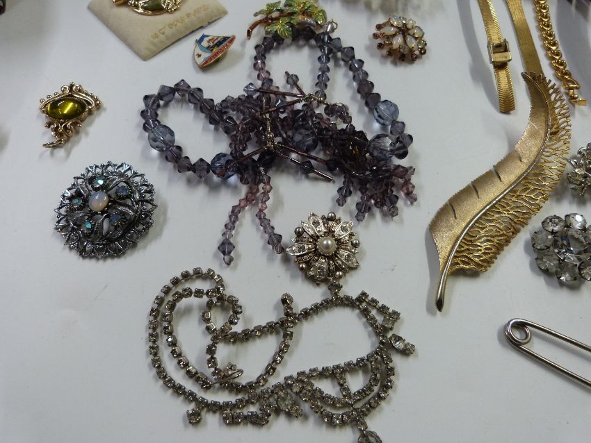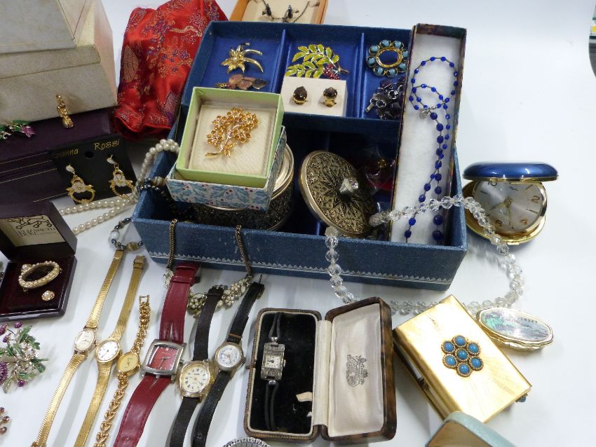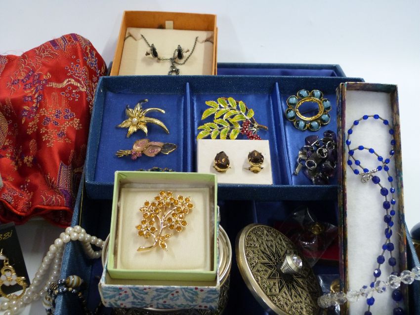 A collection of costume jewellery including large enamel brooches, marcasite, watch, necklaces, inlaid mother of pearl box etc