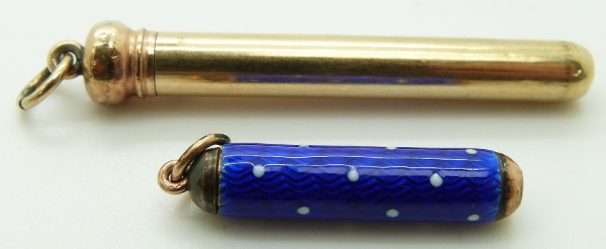 A yellow metal propelling pencil marked with an M and a propelling pencil set with blue enamel