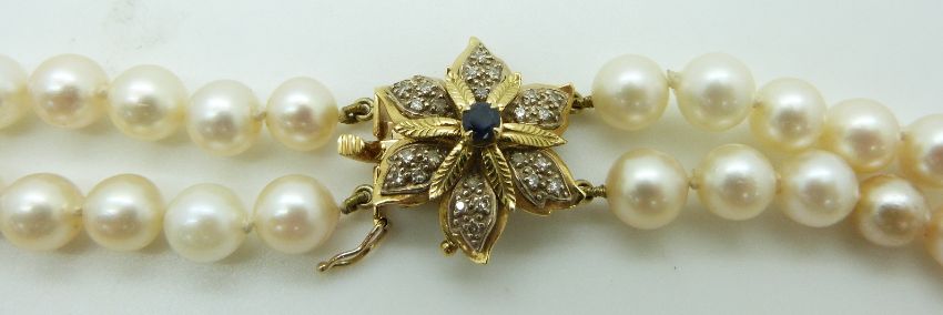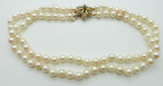 A double strand pearl necklace with 9ct gold clasp set with a sapphire and diamonds