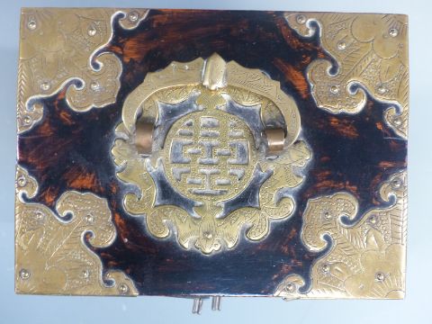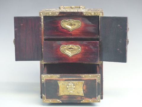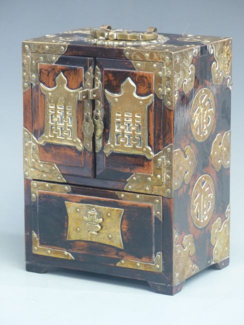 Chinese stained elm brass bound jewellery cabinet with decorative brass mounts and flush fit heart shaped handels to drawers, H 24cm x W 17cm x D 13cm