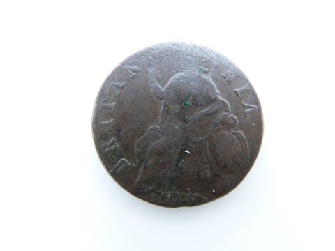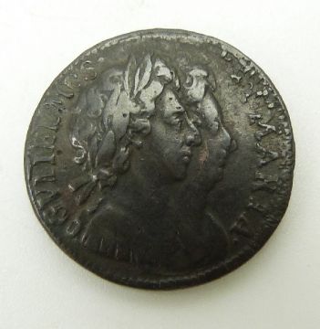 1694 William and Mary halfpenny, F, together with a farthing of the same period, GF and a further NF example