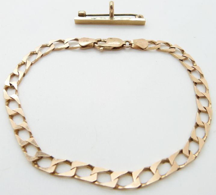 A 9ct gold curb link bracelet and a 9ct gold brooch, 9g