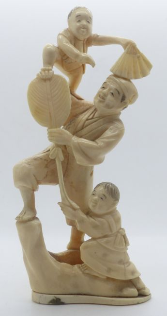 Japanese Meiji period ivory okimono of a man playing with his children, height 18cm