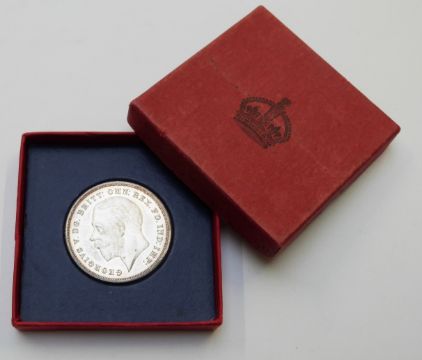 George 1935 raised edge inscription, low mintage silver proof Jubilee 'rocking horse' crown, in original box, unc Spink 4050