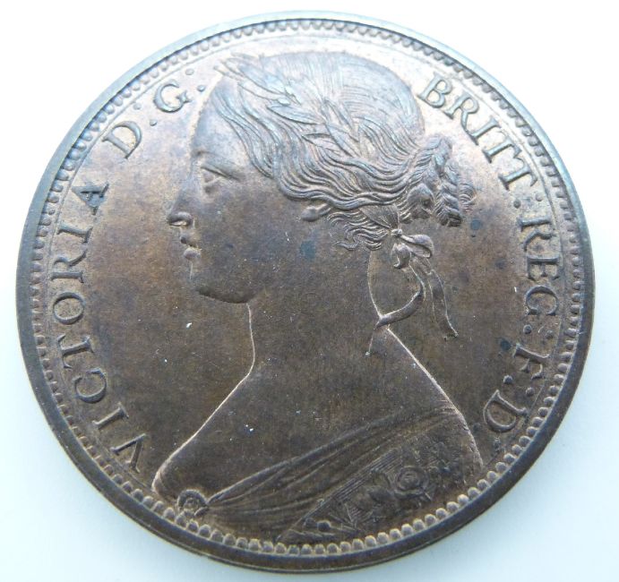 Victorian 1860 bronze young head penny TB together with an 1863 example, VF-EF, both with lustre