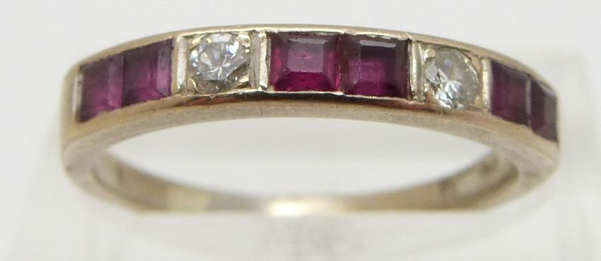 A 9ct gold ring set with square cut rubies and two round cut diamonds, size O