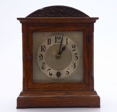 Oak cased mantel clock c1930, the silvered Arabic dial with spade hands, 25cm tall.