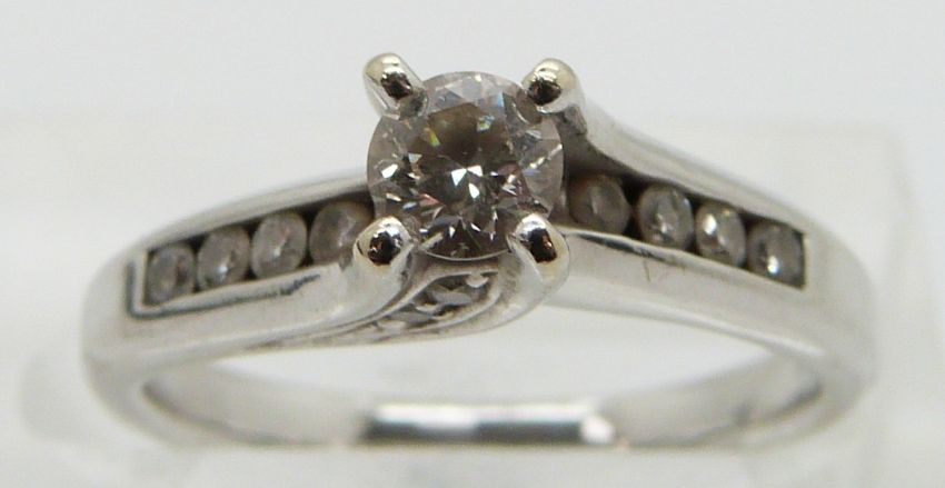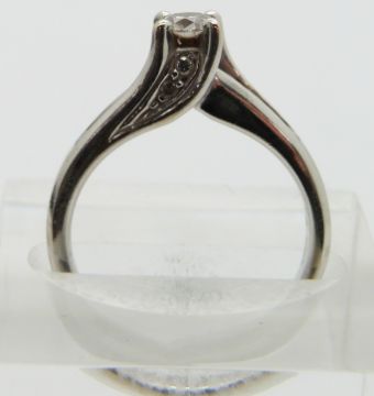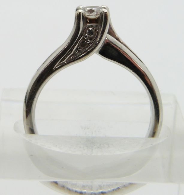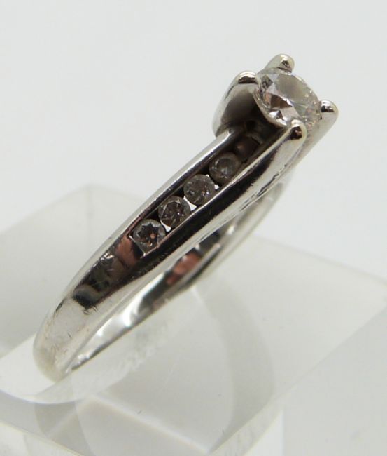 An 18ct white gold ring set with a round cut diamond of approximately 0.25ct with diamond encrusted shoulders, size K