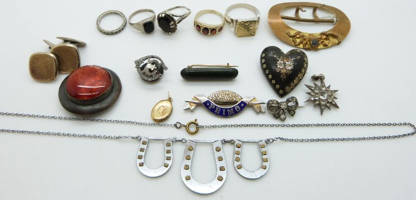 Silver rings, silver brooches, horseshoe necklace by CH Rome, silver cufflinks, paste pendant and brooch etc