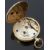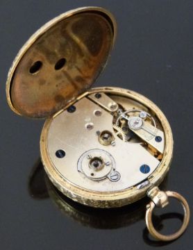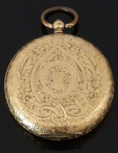 An 18ct gold open faced pocket watch with gold hands, black Roman numerals, gilt decorated white enamel face and engraved case, case diameter 36.5mm, serial number 183333, 39.7g.